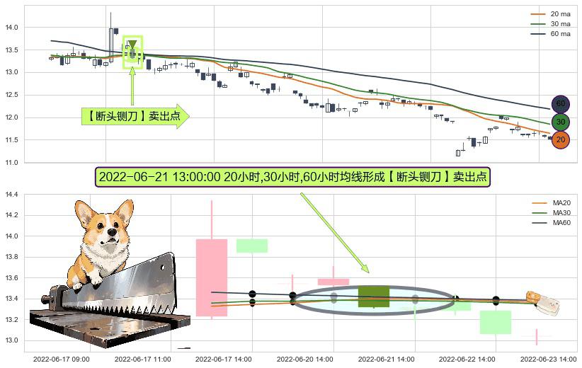 ⚀ 2022-06-21 13:00:00小时显现 20小时-30小时-60小时均线 【断头铡刀】卖出点 看空信号,后市看跌,卖出