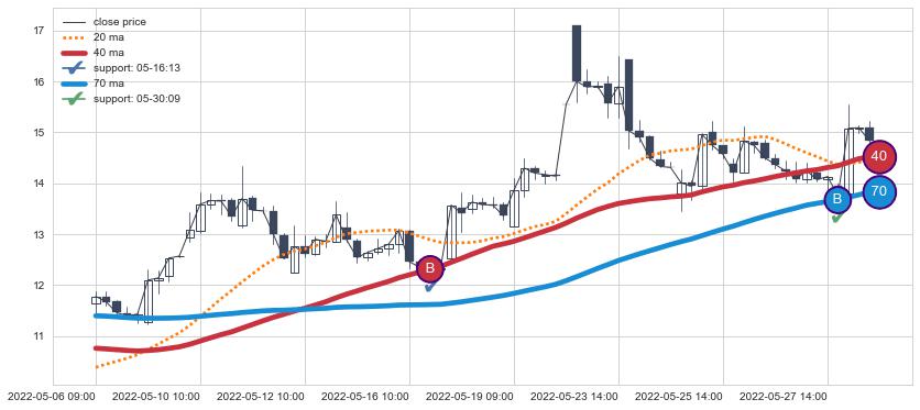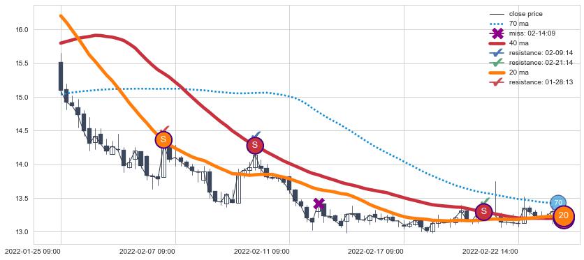 ⚂ 2022-06-17 13:00:00-小时均线向上突破,2022-06-20 13:00:00-小时重新下穿均线破位,均线阻力再次生效