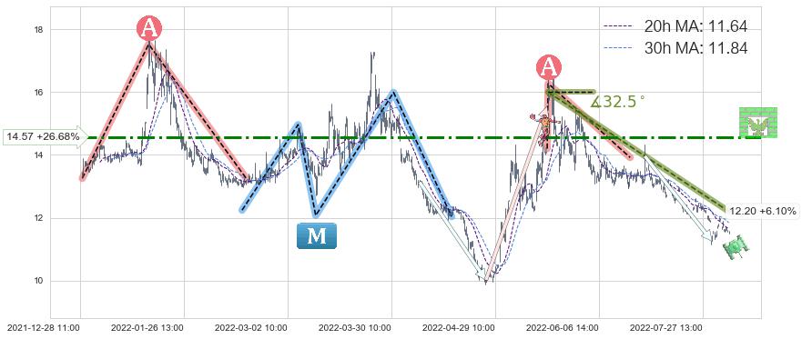从2022-06-14 11:00至2022-08-12 14:00,共包含98个小时,阶段股价下跌-11.37%,阶段股价变动位移路程比: 1 : 7