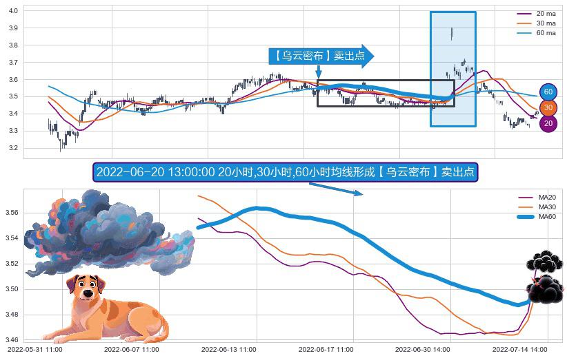 ⚀ 2022-06-09 09:00:00小时-2022-07-13 14:00:00小时显现 20小时-30小时-60小时均线 【乌云密布】卖出点 看空信号,后市看跌,卖出