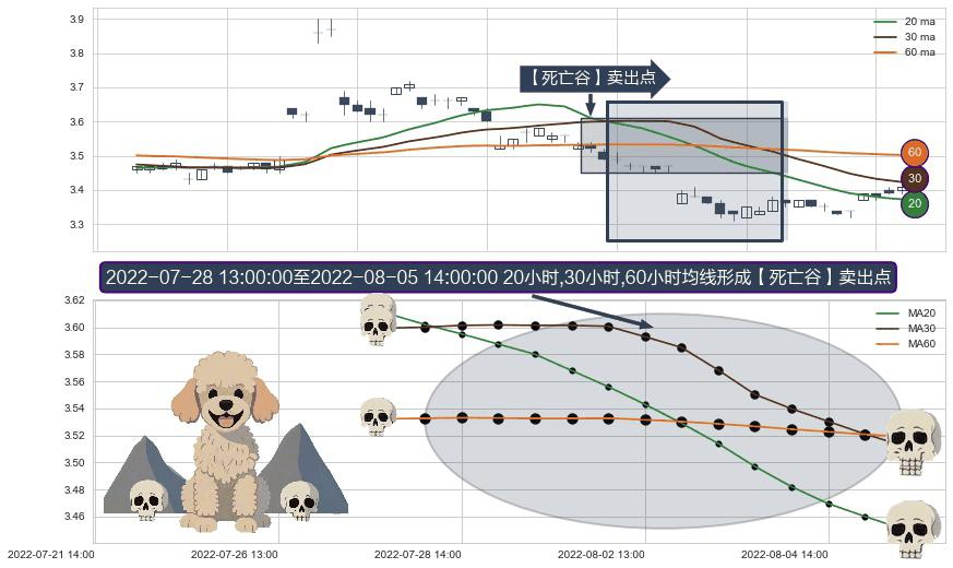 ⚀ 2022-07-28 14:00:00-小时至2022-08-05 14:00:00-小时显现 20小时-30小时-60小时均线 【死亡谷】卖出点 看空信号,后市看跌,卖出