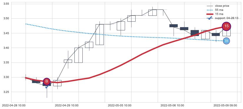 ⚀ 2022-07-19 14:00:00小时-2022-08-10 13:00:00小时显现 10小时-20小时-30小时均线 【高山滑雪】买入点 看多信号,后市看涨,买入