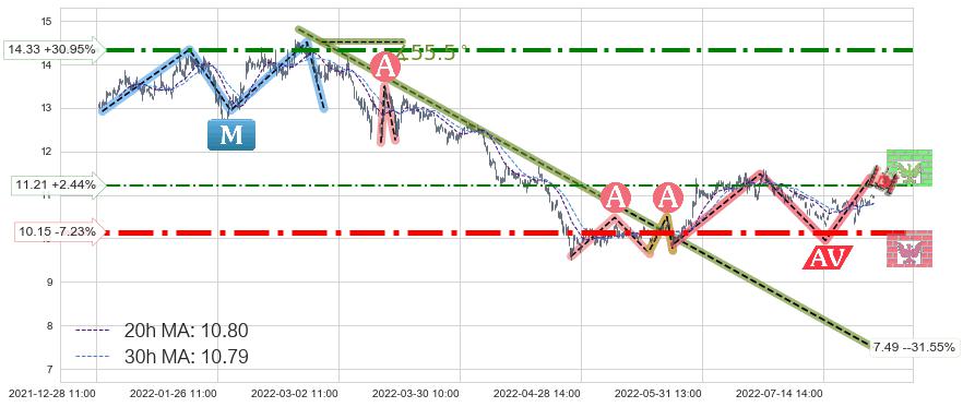 ♘ 支撑价格位10.15,可信任强度90.41%,距离最后交易2022-08-12 14:00形成的收盘价格10.94相差 -7.23%