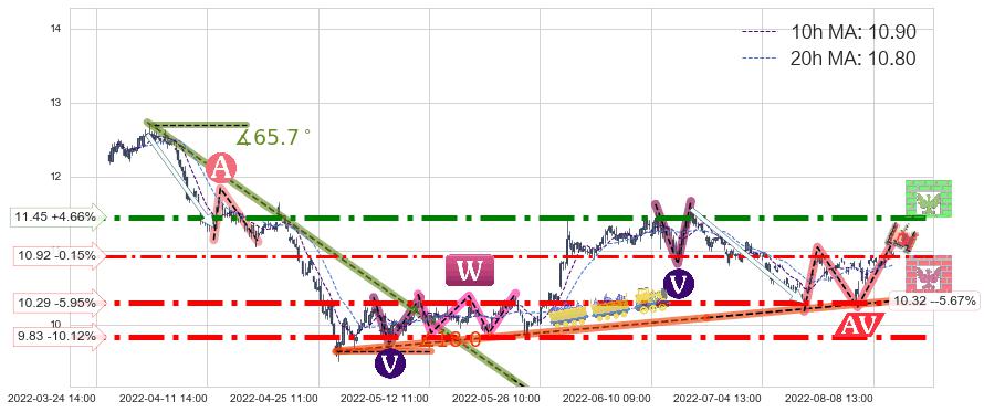 ♘ 支撑价格位10.29,可信任强度96.33%,距离最后交易2022-08-12 14:00形成的收盘价格10.94相差 -5.95%