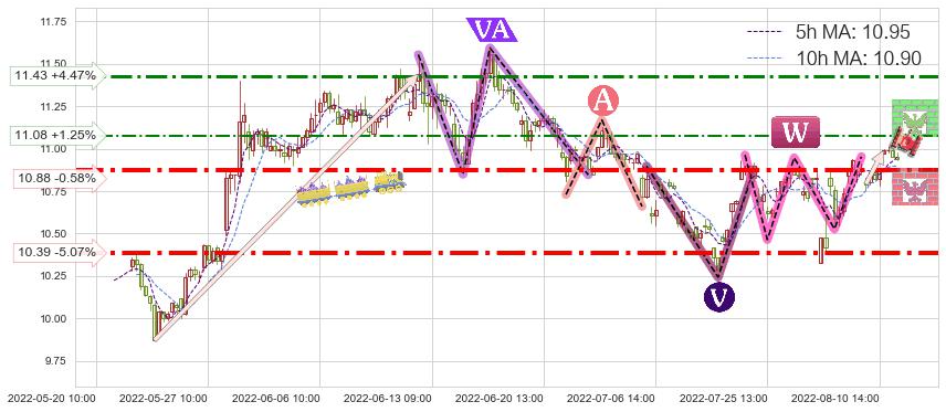 ♞ 5小时均线:10.95,10小时均线:10.90→ 快线>慢线