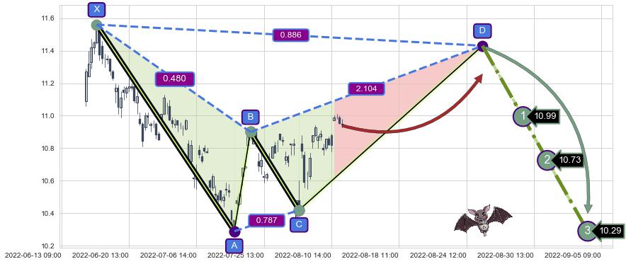 ➣ 未完成【蝙蝠】形态起点X: 06-15:13, 已到达C点: 08-02:14, 预测最终D点: 08-25:12, 共141交易小时