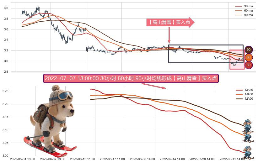 ⚀ 2022-06-10 14:00:00小时-2022-08-11 14:00:00小时显现 30小时-60小时-90小时均线 【高山滑雪】买入点 看多信号,后市看涨,买入