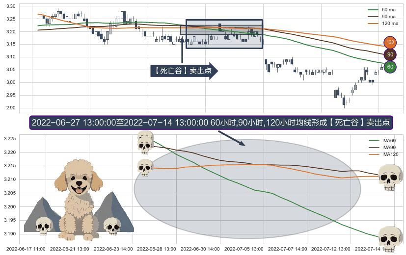 ⚀ 2022-06-27 14:00:00-小时至2022-07-14 13:00:00-小时显现 60小时-90小时-120小时均线 【死亡谷】卖出点 看空信号,后市看跌,卖出