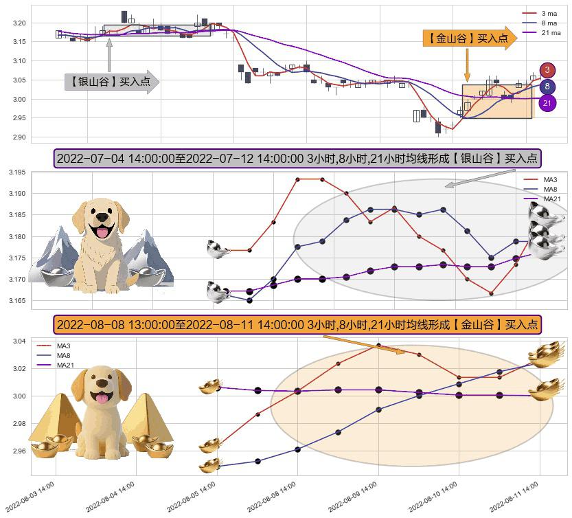 ⚄ 2022-08-08 14:00:00-小时至2022-08-11 14:00:00-小时显现 3小时-8小时-21小时均线 【金山谷】买入点 其再次确认了买入信号,可靠性更强,买入