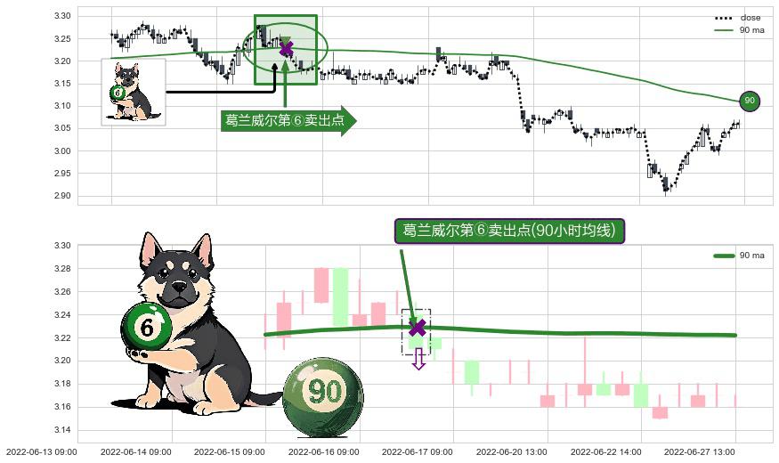 ⚀ 2022-06-16 13:00:00-小时显现 葛兰威尔均线 90小时均线 第⑥卖出点 走势反转见顶信号,后市看跌,卖出信号