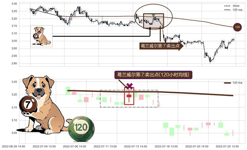 ⚀ 2022-07-12 13:00:00-小时显现 葛兰威尔均线 120小时均线 第⑦卖出点 下降趋势的中继信号,后市看跌,卖出信号