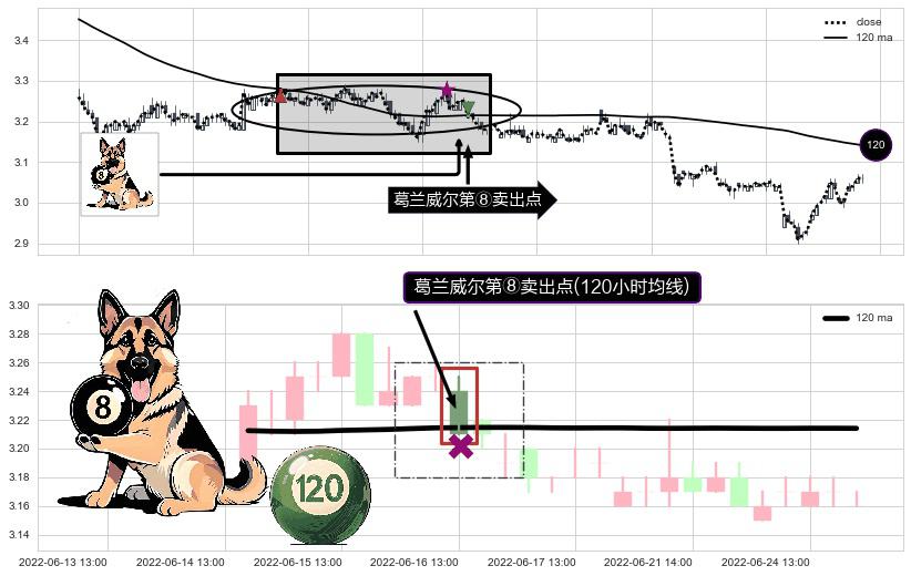 ⚀ 2022-06-16 13:00:00-小时显现 葛兰威尔均线 120小时均线 第⑧卖出点 下降趋势的中继信号,后市看跌,卖出信号