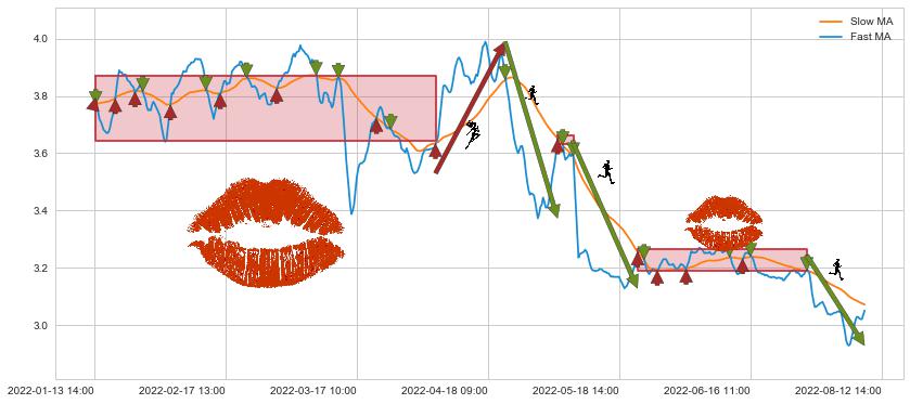 05-23 13:00至07-13 14:00 慢线与快线多次接触,存在上下穿越,有缠绕