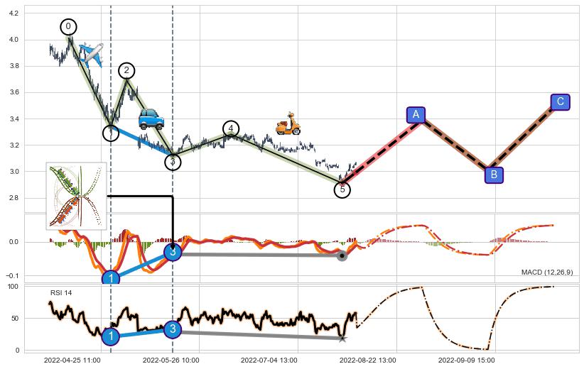 ➣ 第一, 三, 五浪下跌动能逐渐【衰弱变小】,趋势呈现不稳迹象