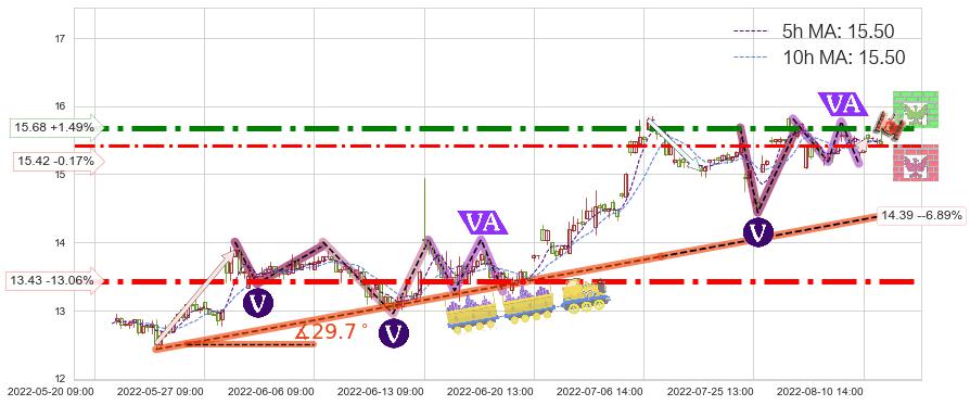 ♘ 阻力价格位15.68,可信任强度86.02%,距离最后交易2022-08-12 14:00形成的收盘价格15.45相差 +1.49%