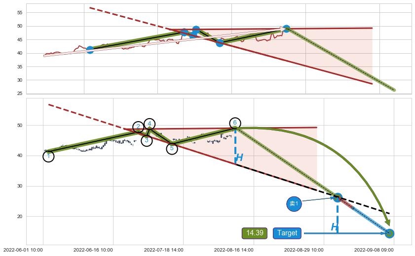 ➢ 最小反转跌幅→𝐇: 11.85 (逐步抬高阻力斜边最后的阻力点⑥与支撑边垂直距离)
