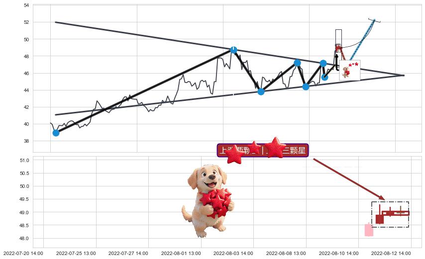 从2022-07-12 14:00至2022-08-12 14:00,共包含47个小时,阶段股价上涨11.72%,阶段股价变动位移路程比: 1 : 4,上涨趋势角度: 9.8