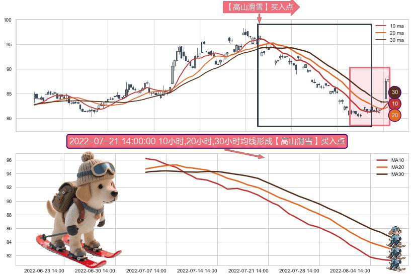 ⚀ 2022-07-05 14:00:00小时-2022-08-08 14:00:00小时显现 10小时-20小时-30小时均线 【高山滑雪】买入点 看多信号,后市看涨,买入