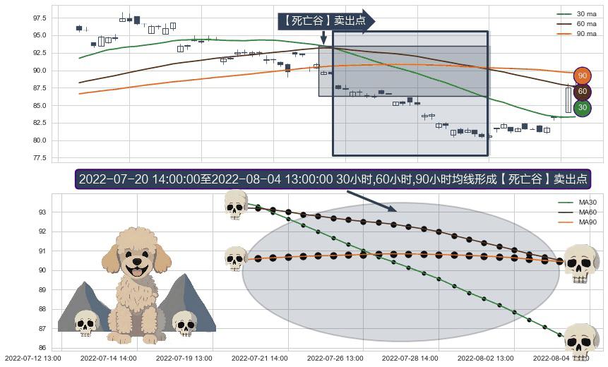 ⚀ 2022-07-21 13:00:00-小时至2022-08-04 13:00:00-小时显现 30小时-60小时-90小时均线 【死亡谷】卖出点 看空信号,后市看跌,卖出