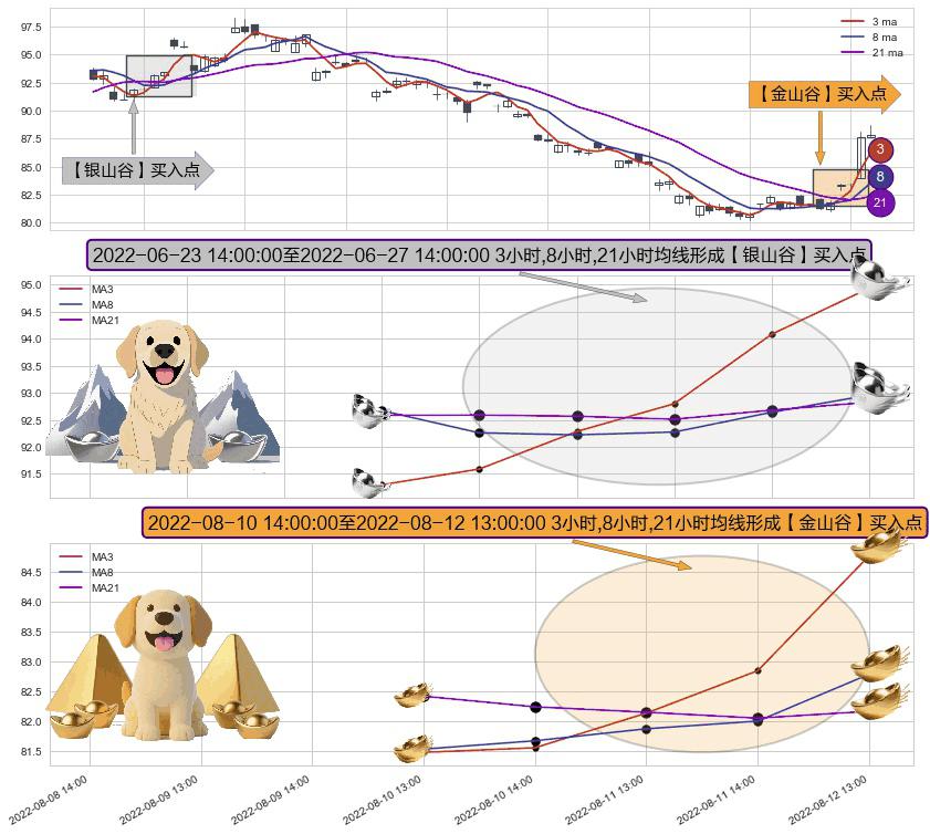⚄ 2022-08-11 13:00:00-小时至2022-08-12 13:00:00-小时显现 3小时-8小时-21小时均线 【金山谷】买入点 其再次确认了买入信号,可靠性更强,买入