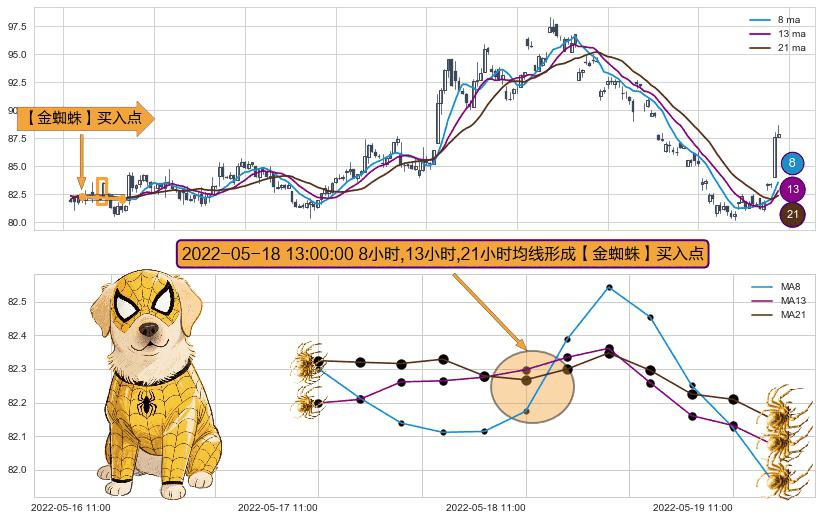 ⚀ 2022-05-18 13:00:00小时显现 8小时-13小时-21小时均线 【金蜘蛛】买入点 看多信号,后市看涨,买入