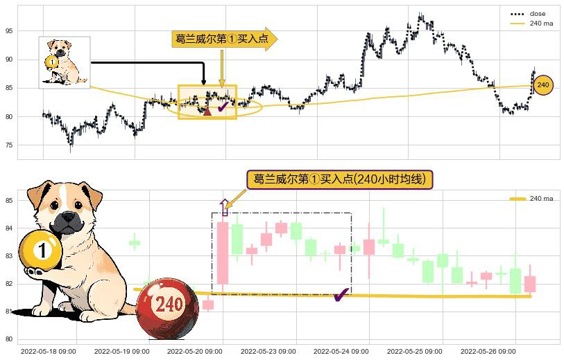 ⚀ 2022-05-20 09:00:00-小时显现 葛兰威尔均线 240小时均线 第买①入点 走势反转见底信号,后市看涨,买进信号