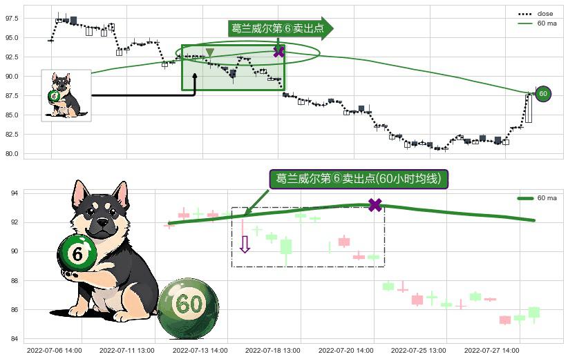 ⚀ 2022-07-14 13:00:00-小时显现 葛兰威尔均线 60小时均线 第⑥卖出点 走势反转见顶信号,后市看跌,卖出信号