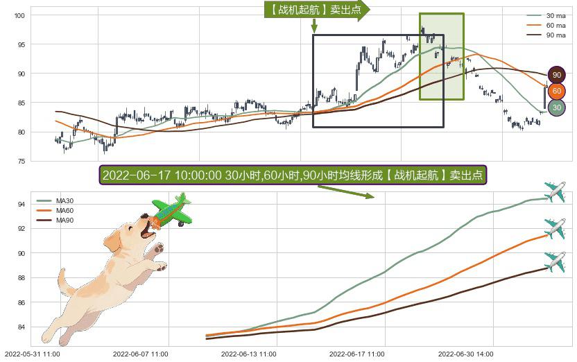 ⚀ 2022-06-08 14:00:00小时-2022-07-07 14:00:00小时显现 30小时-60小时-90小时均线 【战机起航】卖出点 看空信号,后市看跌,卖出