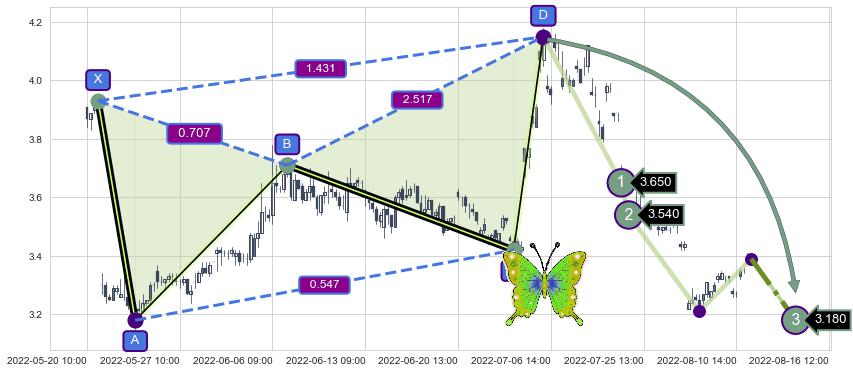 ➣ 已完成【蝴蝶】形态起点X: 05-20:14, 终点D: 07-05:14, 共121交易小时