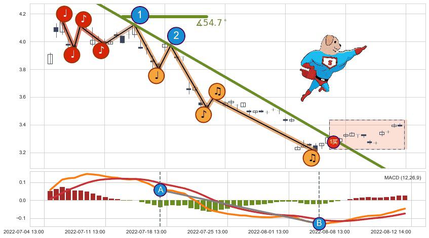 ⚔️ 2022-07-05 14:00-2022-08-11 14:00下跌趋势存在反转上涨[机会],其原下跌趋势的阻力位(3.020)已被突破[强支撑信号],原下跌趋势角度: 54.7˚