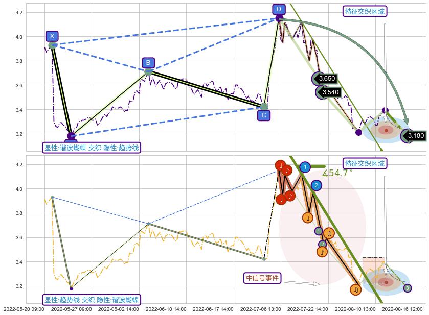 从2022-07-05 14:00至2022-08-11 14:00,共包含55个小时,阶段股价下跌-20.30%,阶段股价变动位移路程比: 1 : 3,下跌趋势角度: 54.7,2022-08-02 13:00向↘︎形成缺口,跳空下跌-5.81%˚