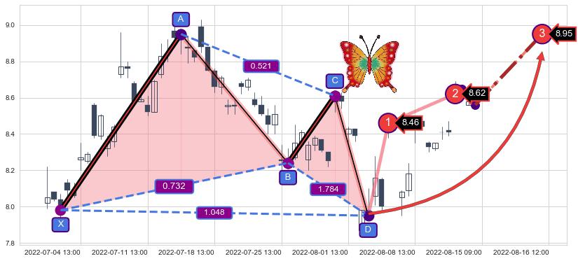 ➣ 已完成【蝴蝶】形态起点X: 06-30:14, 终点D: 08-02:14, 共47交易小时