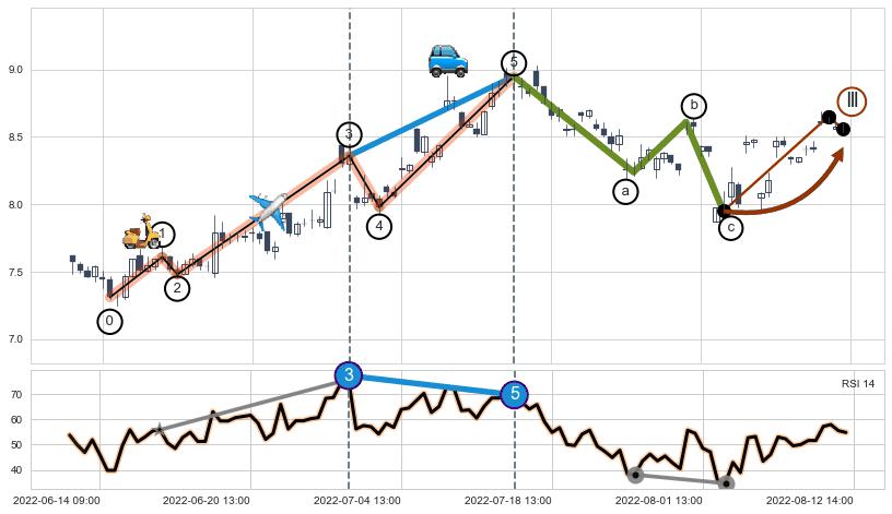 ➣ a,c调整浪MACD, RSI, KDJ走势都【未出现】背离,abc走势延续, 5浪反转概率增强
