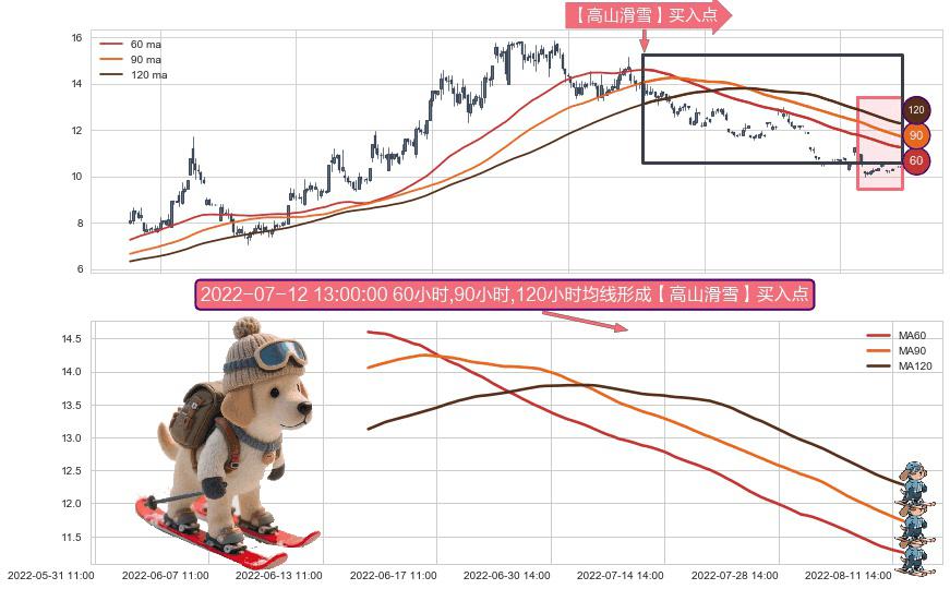 ⚀ 2022-06-15 09:00:00小时-2022-08-12 14:00:00小时显现 60小时-90小时-120小时均线 【高山滑雪】买入点 看多信号,后市看涨,买入