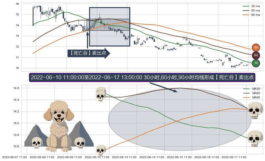 ⚀ 2022-06-10 13:00:00-小时至2022-06-17 13:00:00-小时显现 30小时-60小时-90小时均线 【死亡谷】卖出点 看空信号,后市看跌,卖出