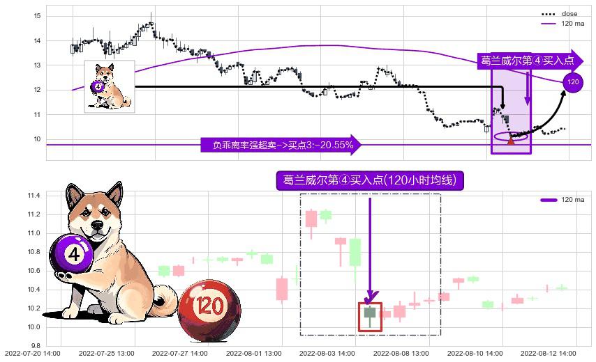 ⚀ 2022-08-04 13:00:00-小时显现 葛兰威尔均线 120小时均线 第④买入点 下降趋势均值回复的短线反弹信号,后市看涨,买进信号