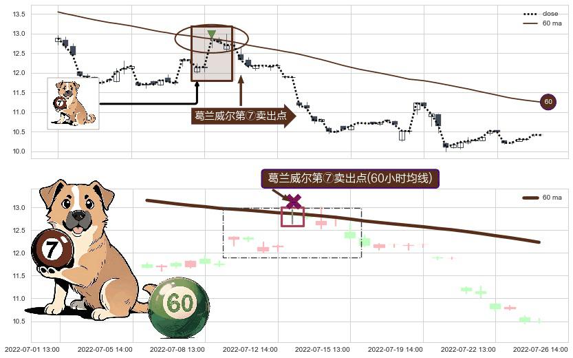 ⚀ 2022-07-13 13:00:00-小时显现 葛兰威尔均线 60小时均线 第⑦卖出点 下降趋势的中继信号,后市看跌,卖出信号