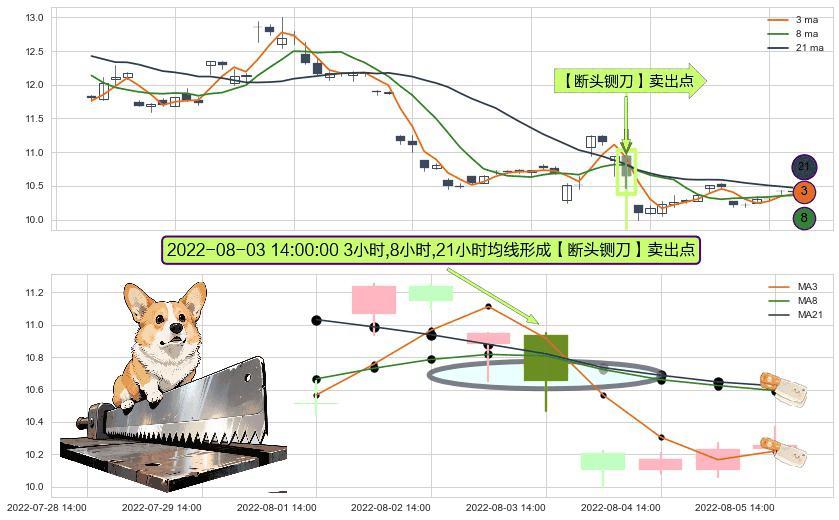 ⚀ 2022-08-03 14:00:00小时显现 3小时-8小时-21小时均线 【断头铡刀】卖出点 看空信号,后市看跌,卖出