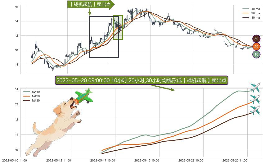 ⚀ 2022-05-13 14:00:00小时-2022-05-25 13:00:00小时显现 10小时-20小时-30小时均线 【战机起航】卖出点 看空信号,后市看跌,卖出