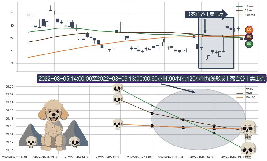 ⚀ 2022-08-08 13:00:00-小时至2022-08-09 13:00:00-小时显现 60小时-90小时-120小时均线 【死亡谷】卖出点 看空信号,后市看跌,卖出