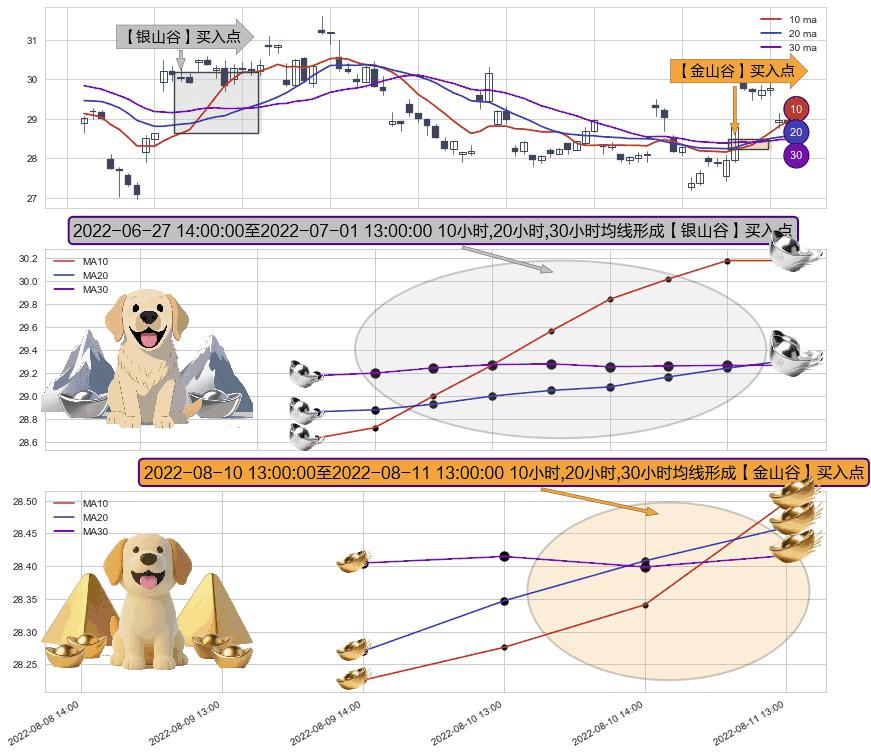 ⚃ 2022-08-10 14:00:00-小时至2022-08-11 13:00:00-小时显现 10小时-20小时-30小时均线 【金山谷】买入点 其再次确认了买入信号,可靠性更强,买入