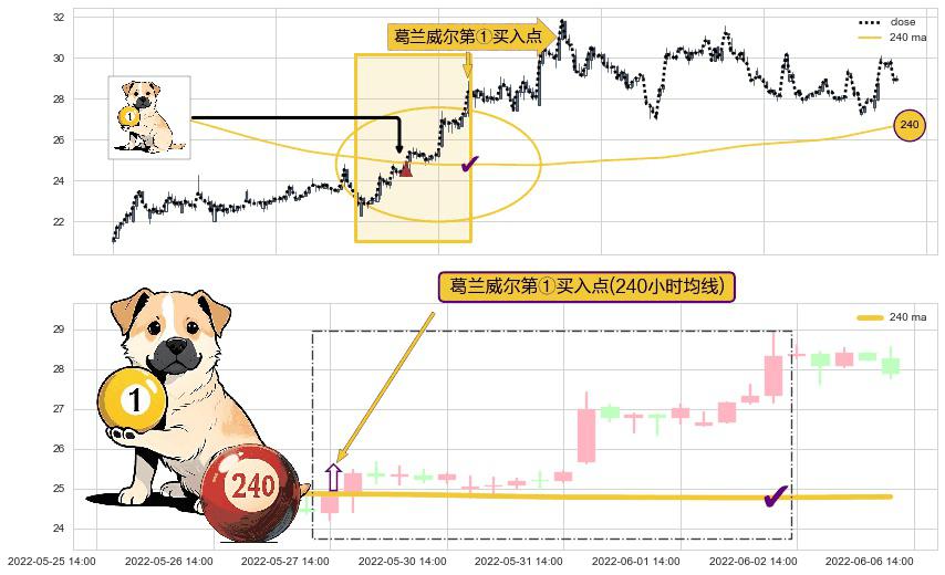 ⚀ 2022-05-27 14:00:00-小时显现 葛兰威尔均线 240小时均线 第买①入点 走势反转见底信号,后市看涨,买进信号