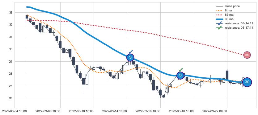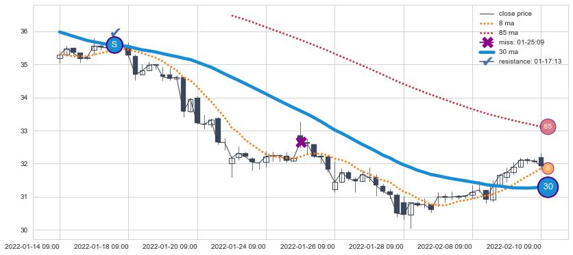 ⚁ MA10和MA20走势平行,且始终保持在短距离内,MA30始终在短中期均线上方,与短中期均线保持一定的距离,微微下行