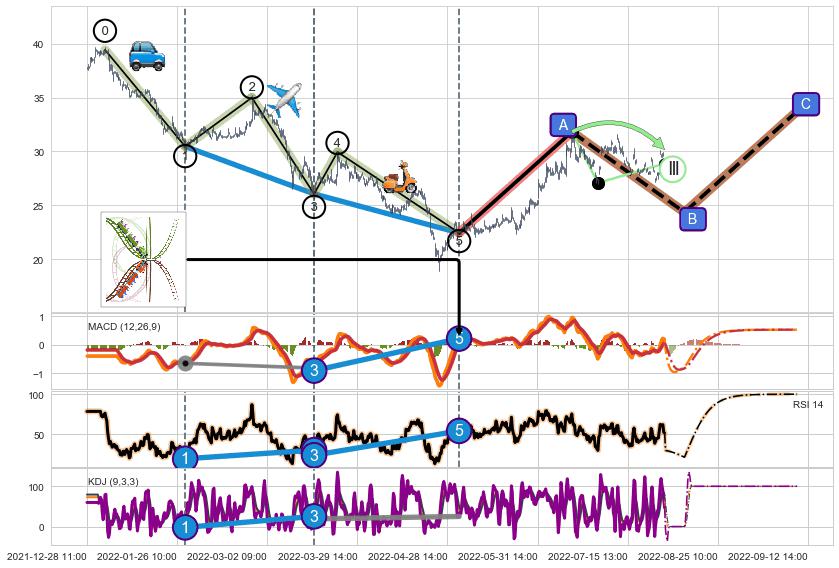 ➣ 1,3,5驱动浪MACD, RSI, KDJ走势都出现【常规背离】反转信号增强