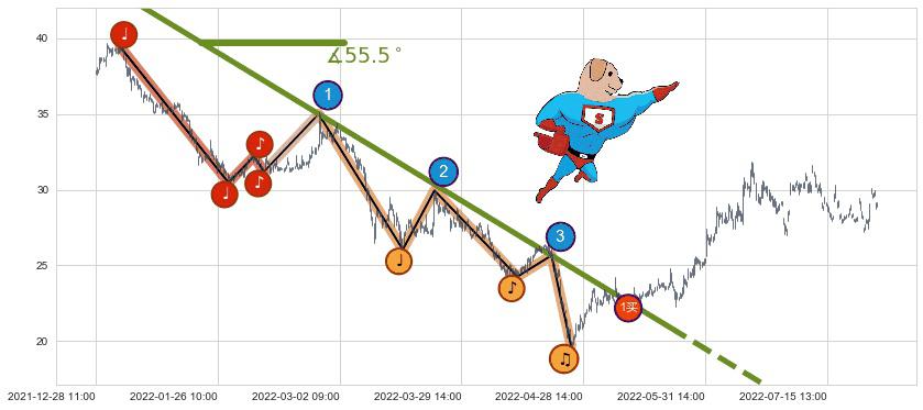 从2022-01-04 11:00至2022-05-23 14:00,共包含451个小时,阶段股价下跌-46.98%,阶段股价变动位移路程比: 1 : 8,下跌趋势角度: 55.5