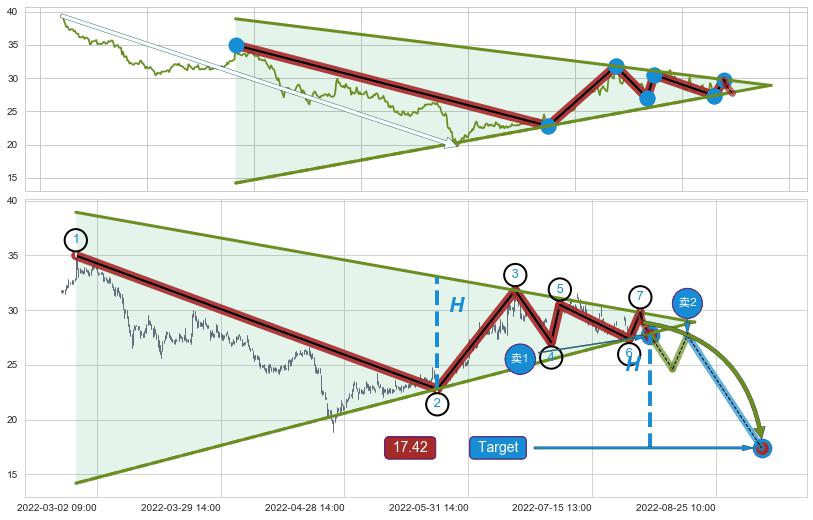 ➢ 最小中继整理跌幅→𝐇: 10.28 (低点逐步抬高斜边第一支撑点②与阻力边垂直距离)