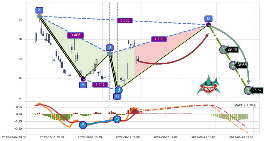 ➢ 距离预测D点位置尚有上涨空间,短线依然【看涨】, 耐心等待看跌【鲨鱼】形态反转启动