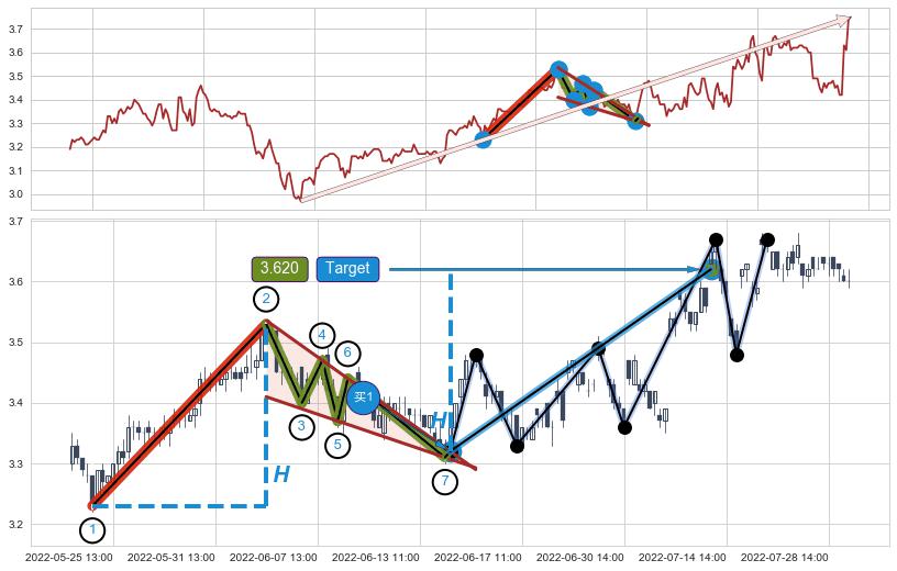 ➢ 最小中继整理涨幅→𝐇: 0.30000 (𝐇楔型旗杆的长度:楔型起点→顶点)