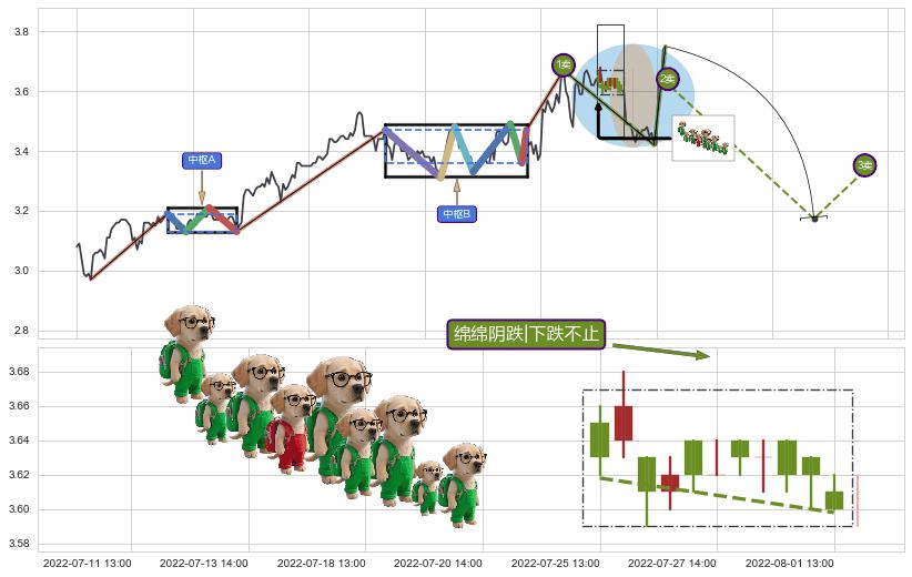 ➣ 【中枢B】:06-07:14-07-01:14,中枢由7笔构成,共62交易小时, ZG=3.470, ZD=3.360