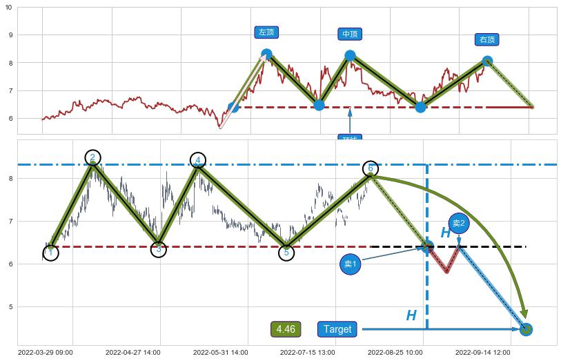 ➢ 最小反转跌幅→𝐇: 1.9300 (三重顶波峰高点到两个波谷连线的垂直距离)